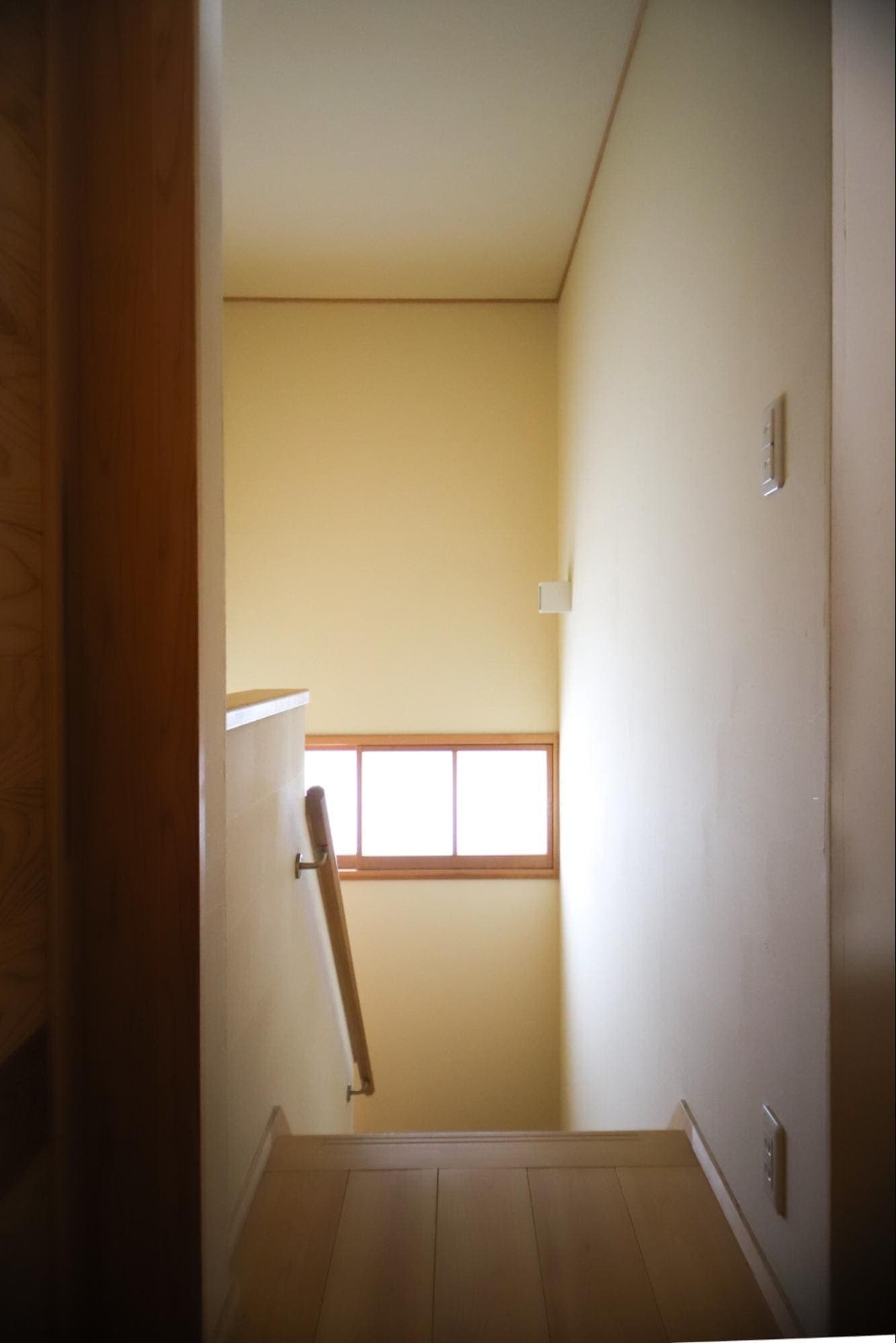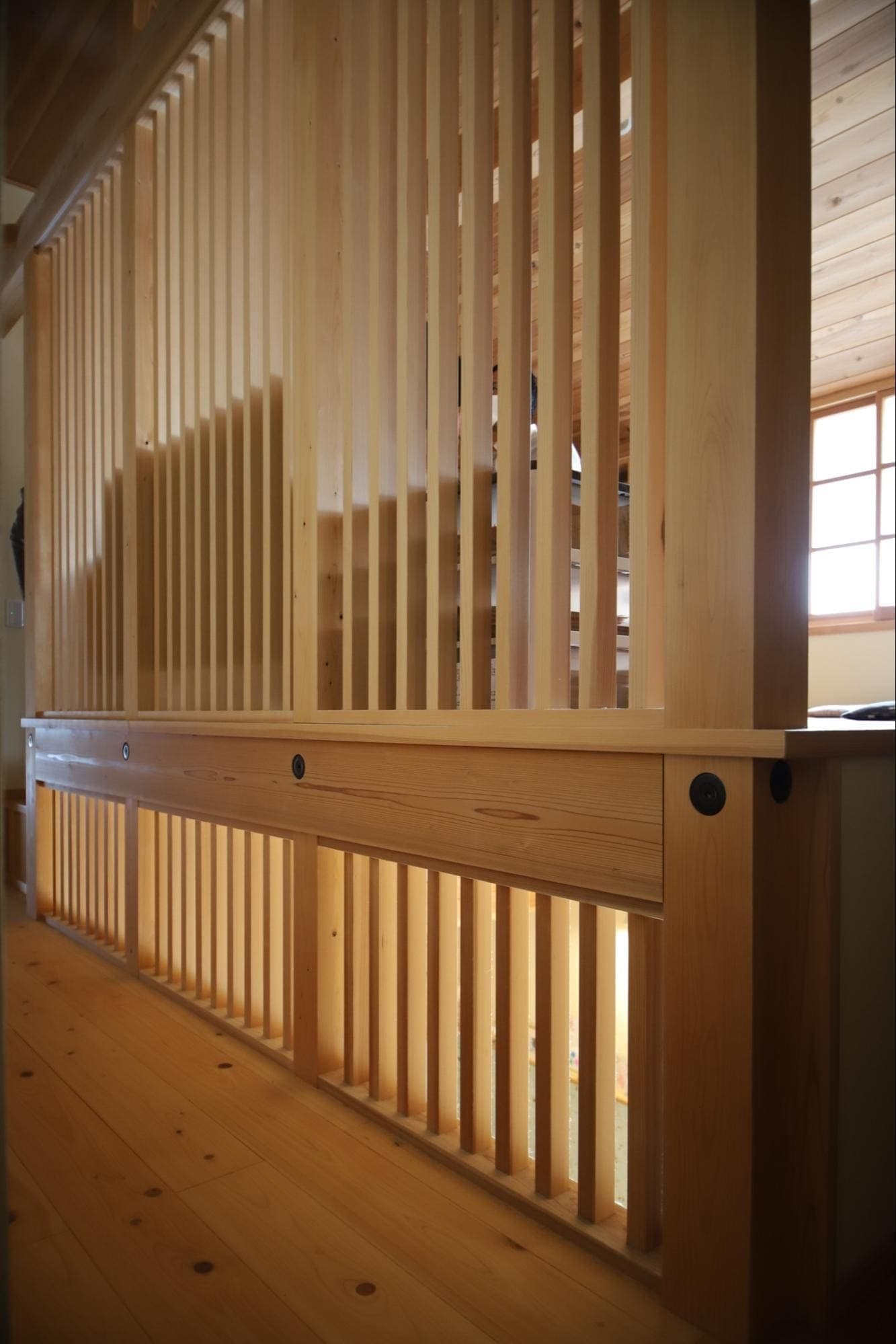薪ストーブの暖かさも伝わるので、2Fは暖房機器なしで、十分暖かい。床をあげた壁の一部は木格子にし、1Fから光と風を運び入れている。面している廊下も明るい。