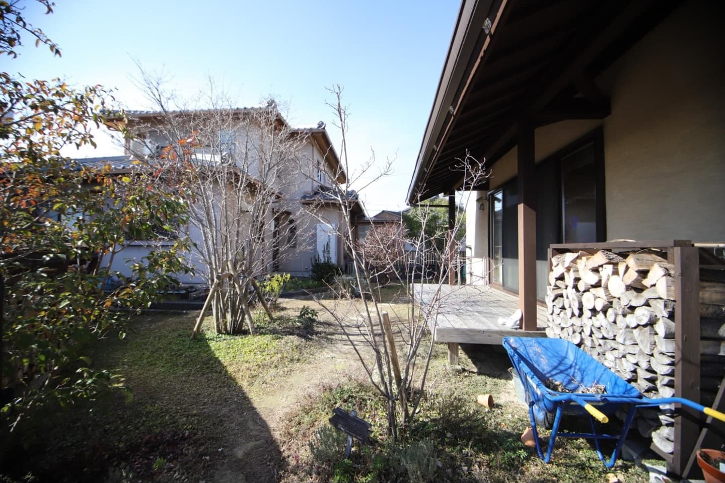 室内にお邪魔すると、「ログハウスもいいなぁと思っていました」というO様らしく、リビングに薪ストーブがあり、一部大谷石と木板張りの壁面も相まって山荘のようにも感じる雰囲気で、パチパチと燃える炎が暖かく、冬らしい風景。窓から見えるお庭に目を移すと、葉を落とし綺麗な樹形を見せてくれるヤマボウシが、柔らかな日差しを浴びてキラキラと輝いていました。