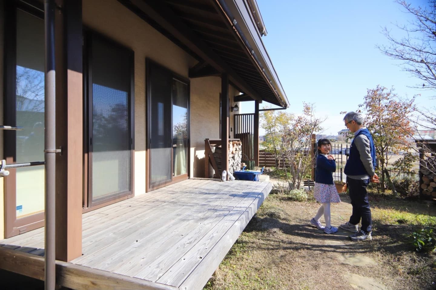 リビングとお庭の中間域にあるウッドデッキ。気候の良い時は、ここでお茶をしたり、お庭仕事の合間に腰掛けたり、洗濯物を干したりと、使い勝手が良い。