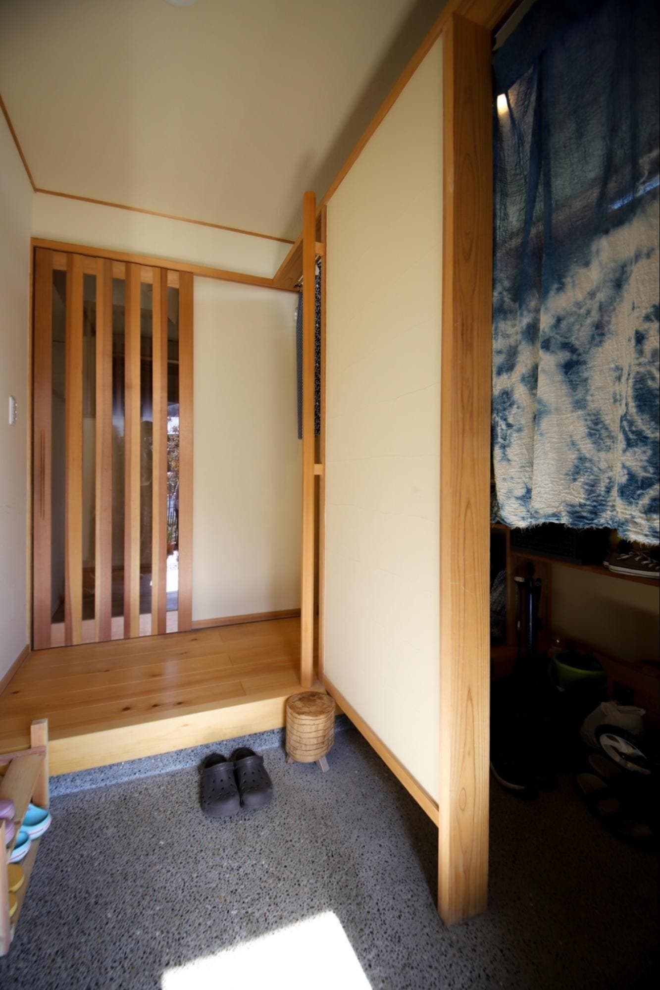 肌触りの良い桧の床、一部建具に組み込まれたO様お気に入りのガラス、玄関ホール横のクロークにはご主人が染めた暖簾。好きなものが詰まった住まい。